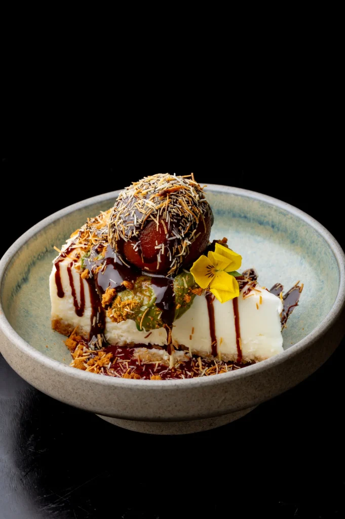 Dedicated to Dubai’s expat Kerala community . Baked vanilla cheesecake , pistachio , warm gulab jamun, kunafa & Chocolate sauce ( N )